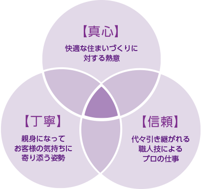 「思い出のつまった大切な家だから、いつまでも大事にして安心して暮らしたい。」 そんな願いを叶えるお手伝いがしたいという想いで会社を立ち上げました。 どんな家族にも住まいと共に育んできた大切な思い出があると思います。 大切な住まいのことだからこそ、どの業者に頼んでいいのか分からない、そのお気持ちはすごくよく分かります。 そんな時はどうぞお気軽にご相談下さい。 代々引き継がれる職人技、そして何よりお客様の安心した笑顔が見たいという実直な想いには自信があります。 私たちは “誠心誠意”というコンセプトのもと、これからもひとりでも多くのお客様に「任せてよかった」と言っていただけるよう、社員一同住まいづくりに誠実に向き合ってまいります。 今後とも格別のご支援、ご愛顧を賜りますようよろしくお願い申し上げます。